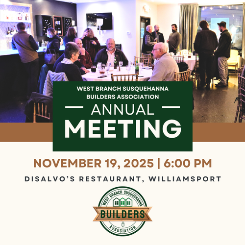 Join the West Branch Susquehanna Builders Association and your fellow industry colleagues at our Annual Membership Meeting. This is an excellent opportunity to network and engage with WBSBA to get the most out of your membership. Bring your ideas for the upcoming year. Come enjoy great food in a fun atmosphere at DiSalvo's Restaurant.
